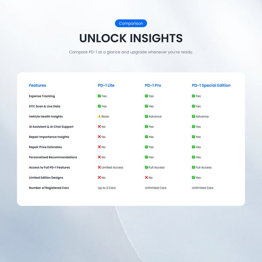 PD‑1 uses AI to analyze real-time vehicle data, detect hidden patterns, and predict potential issues before they happen, giving you smarter insights.